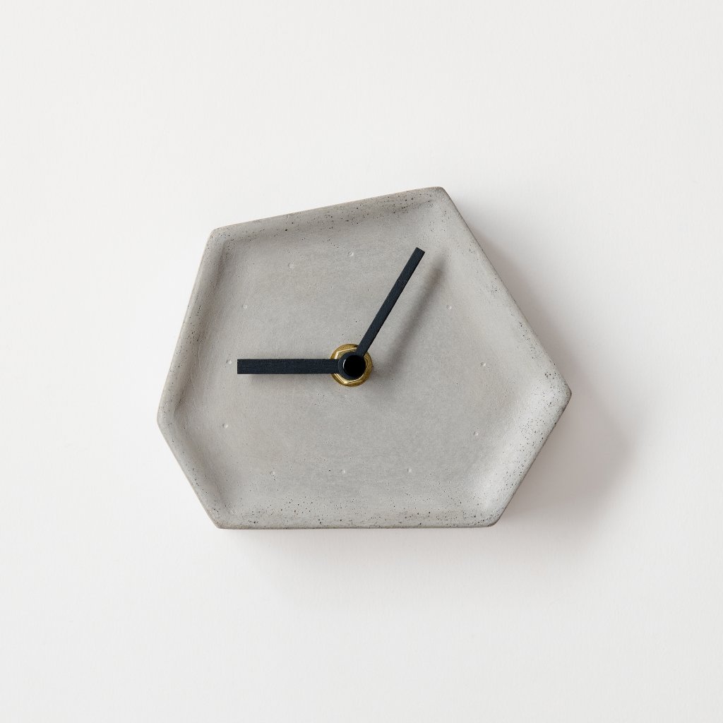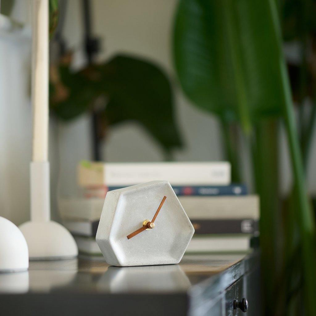 Minimalist concrete table clock Crater with dimensions 13,5 × 11 cm – handcrafted in the Czech Republic. This design clock made from Portland concrete stands out with its simple shape and natural aesthetic.