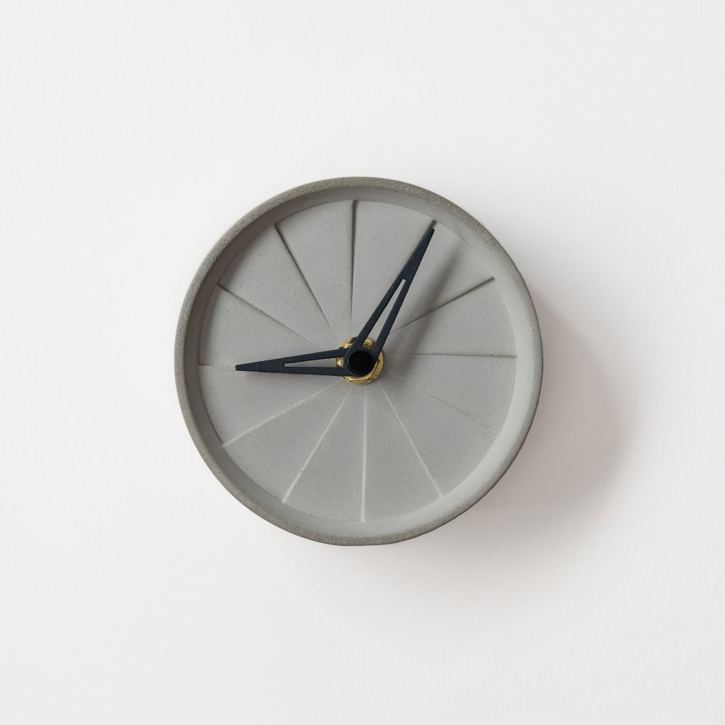 Minimalist concrete table clock Pie with a diameter of 10,5 cm – handcrafted in the Czech Republic.