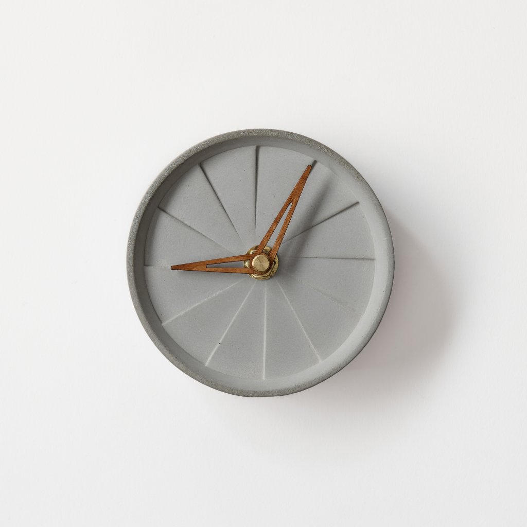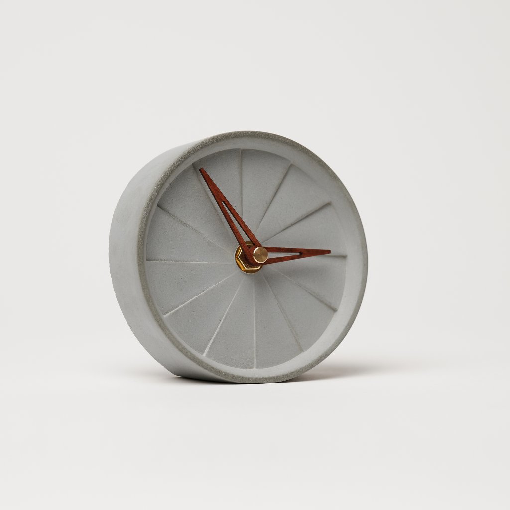 Minimalist concrete table clock Pie with a diameter of 10,5 cm – handcrafted in the Czech Republic.