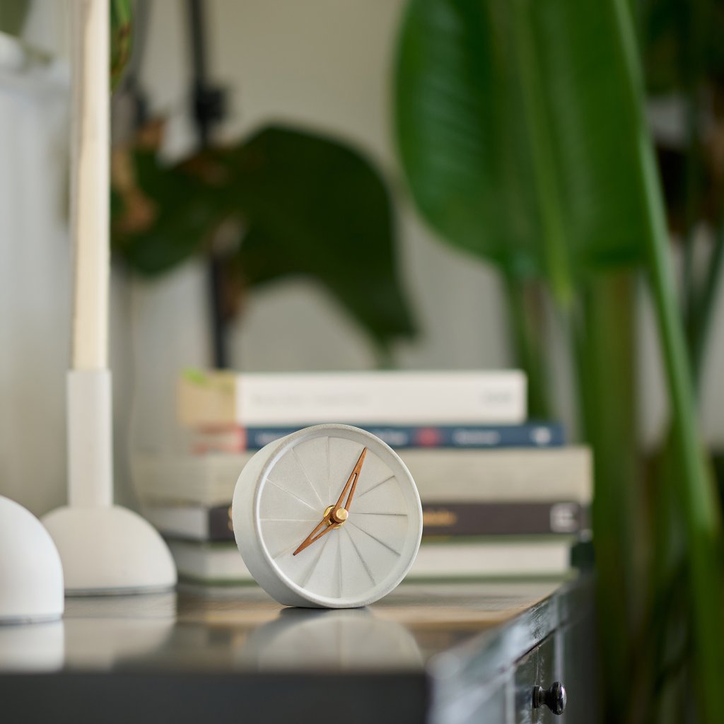 This compact clock made from Portland concrete stands out with its simple design and natural look. The wooden clock hands create a pleasant contrast, while the silent movement ensures smooth and quiet operation. Perfect for a desk, nightstand, or shelf. Each piece is unique thanks to handmade production.