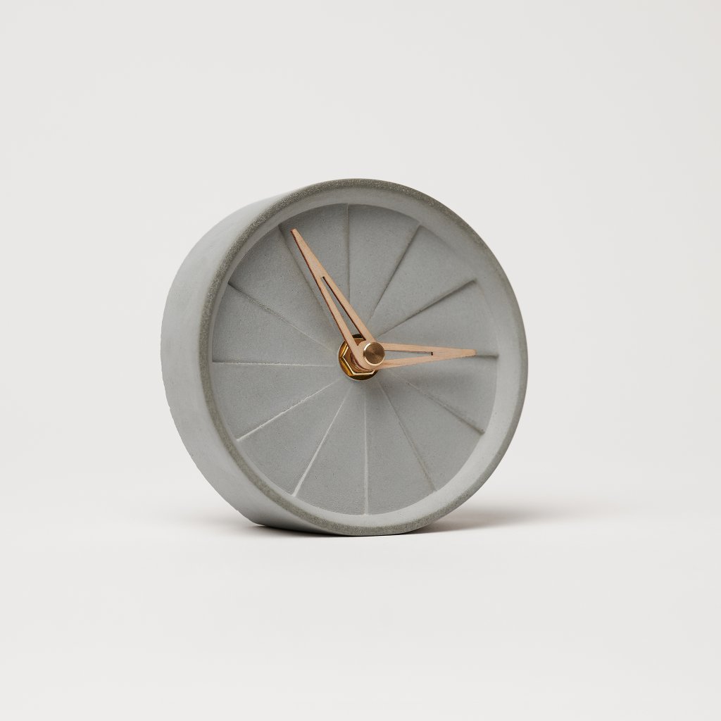 Minimalist concrete table clock Pie with a diameter of 10,5 cm – handcrafted in the Czech Republic.