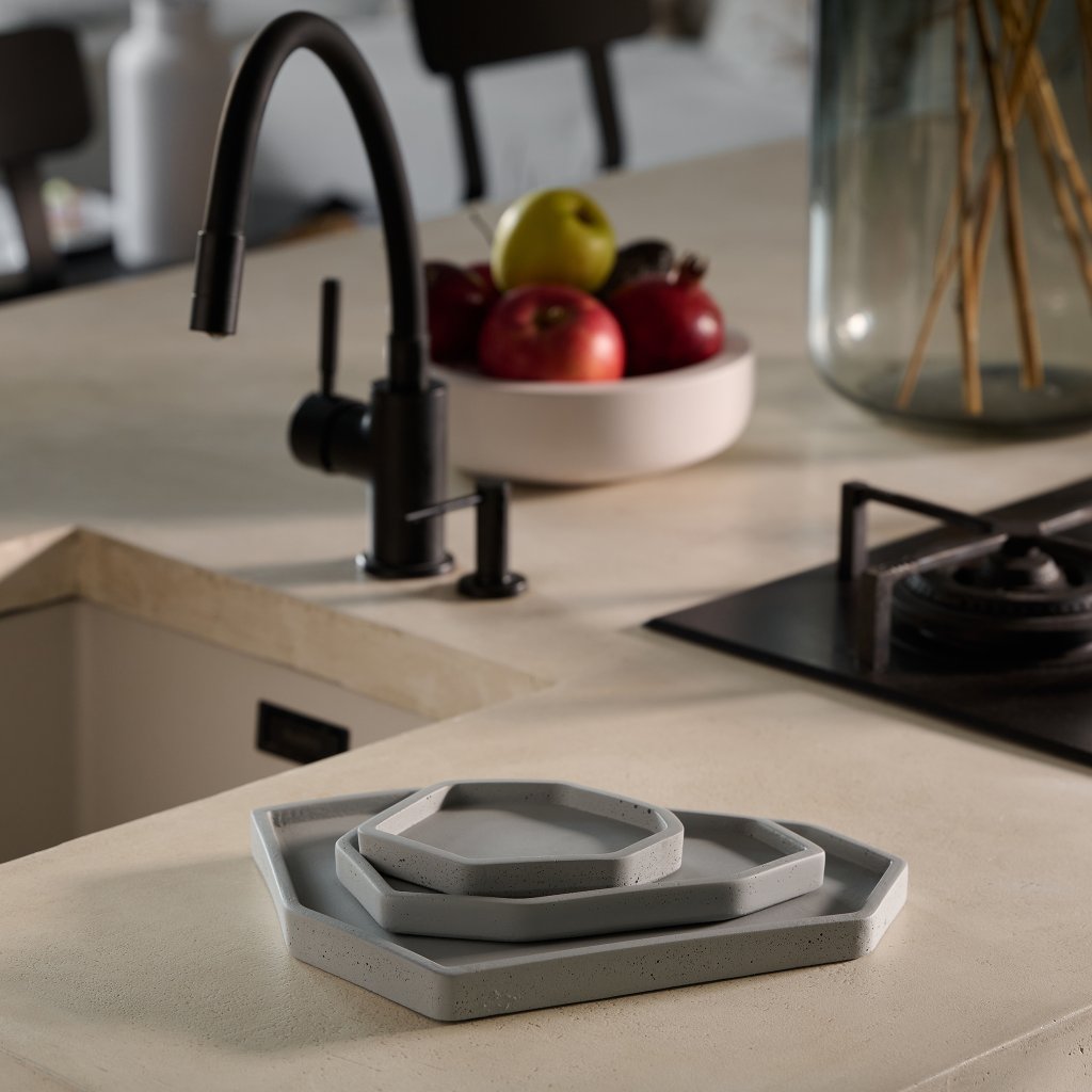 A stylish tray with a minimalist design, perfect for holding jewelry, keys, candles, or small items. The smooth concrete surface is treated with high-quality impregnation, protecting it from stains and making maintenance easy. Available in three sizes or as a complete set.
