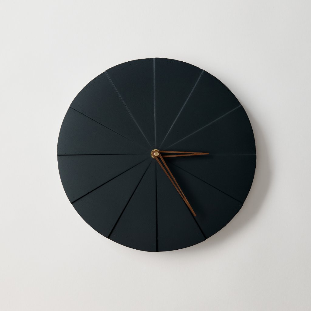 Minimalist Concrete Clock Pie – 28,5 cm in Graphite (Black) – Handcrafted in the Czech Republic.
