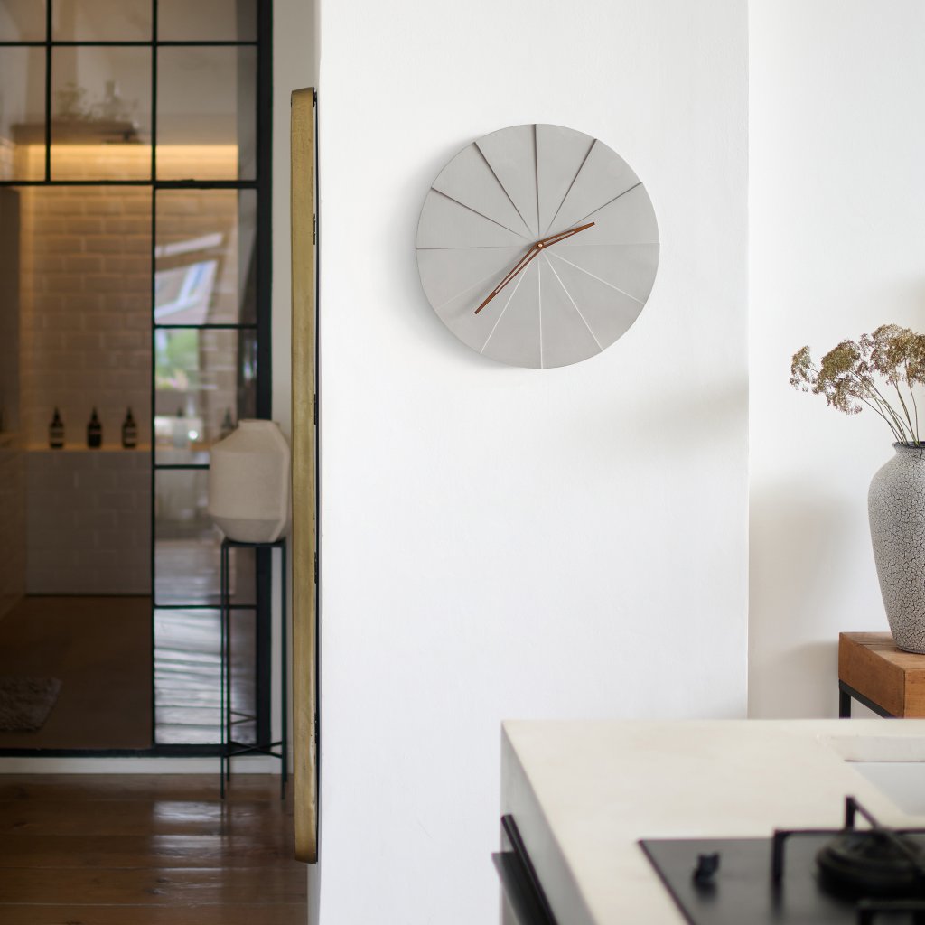 This original wall clock combines the strength of concrete with a unique design and natural aesthetics. Wooden hands add a warm accent, and the silent mechanism ensures smooth, uninterrupted operation.