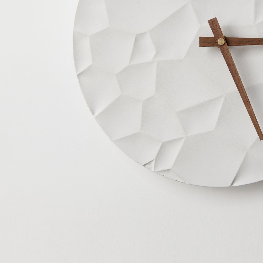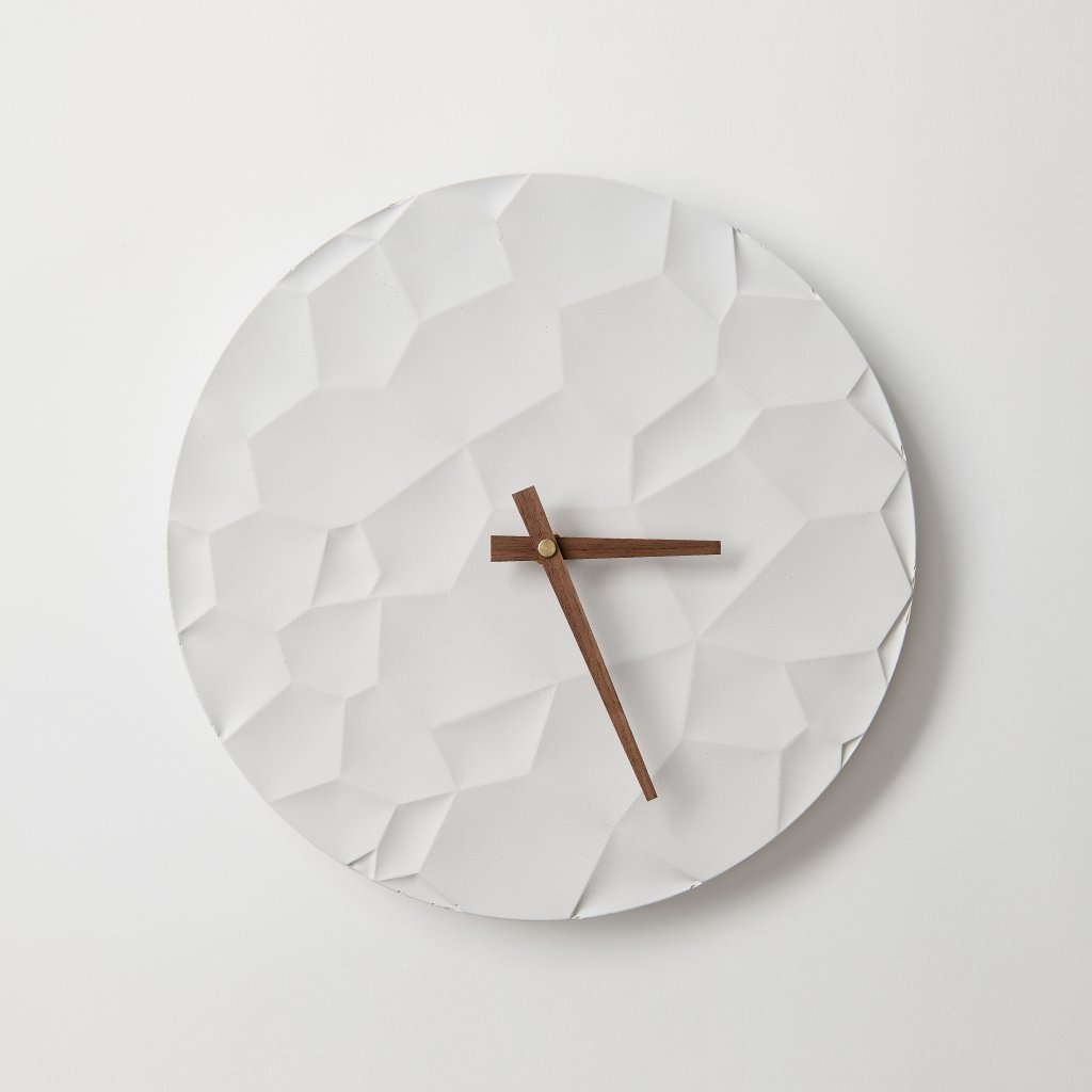 Minimalist Concrete Clock Moon Crater – 30 cm in White – Handcrafted in the Czech Republic.