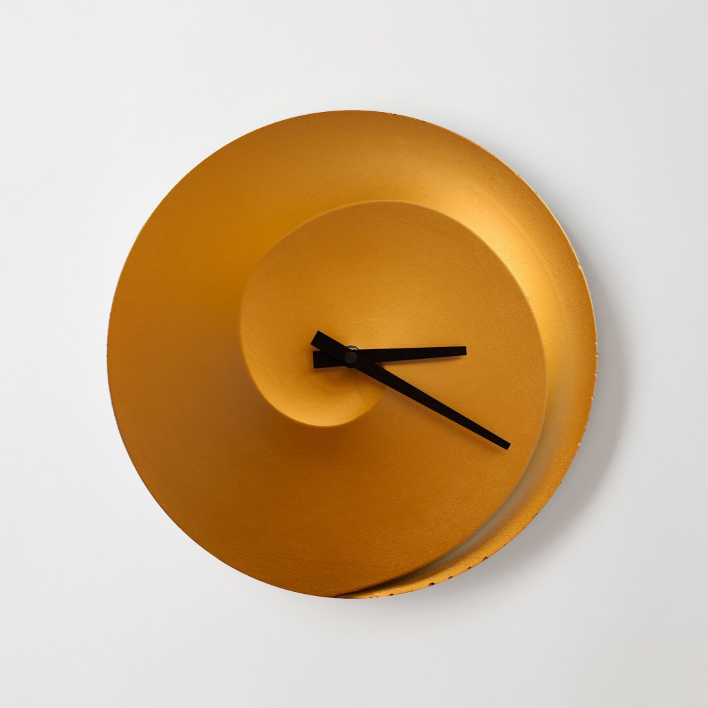 Minimalist Concrete Clock Spiral – 30 cm in Golden Copper – Handcrafted in the Czech Republic.