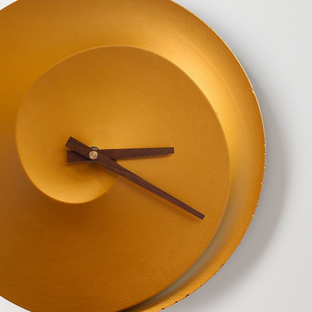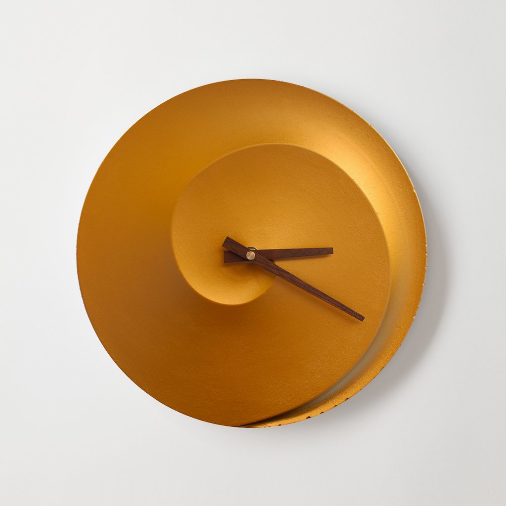 Minimalist Concrete Clock Spiral – 30 cm in Golden Copper – Handcrafted in the Czech Republic.